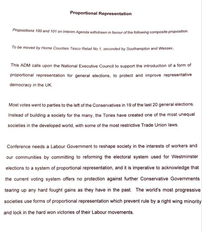 USDAW’s Annual Delegate Meeting voted in favour of proposition 88 - adopting policy strongly in favour of Proportional Representation for general elections.